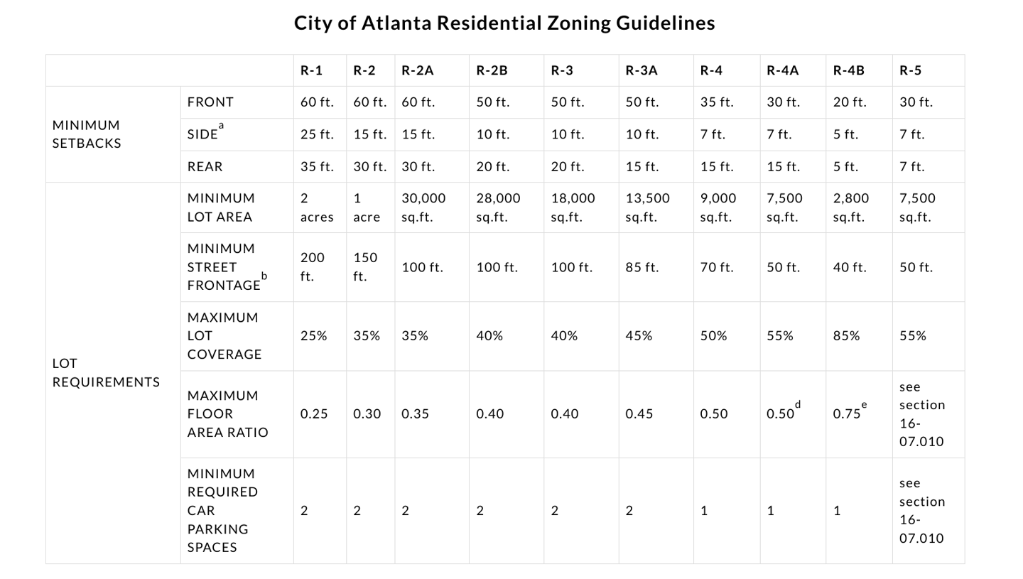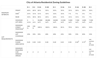 The ten residential zoning districts in the City of Atlanta are designated as R-1 through R-5. Along with the setbacks and lot restrictions, each district is shown in the table below. When building a new house, renovating an existing one, adding a pool or other secondary structure, or shopping for a new property, this knowledge might be useful.